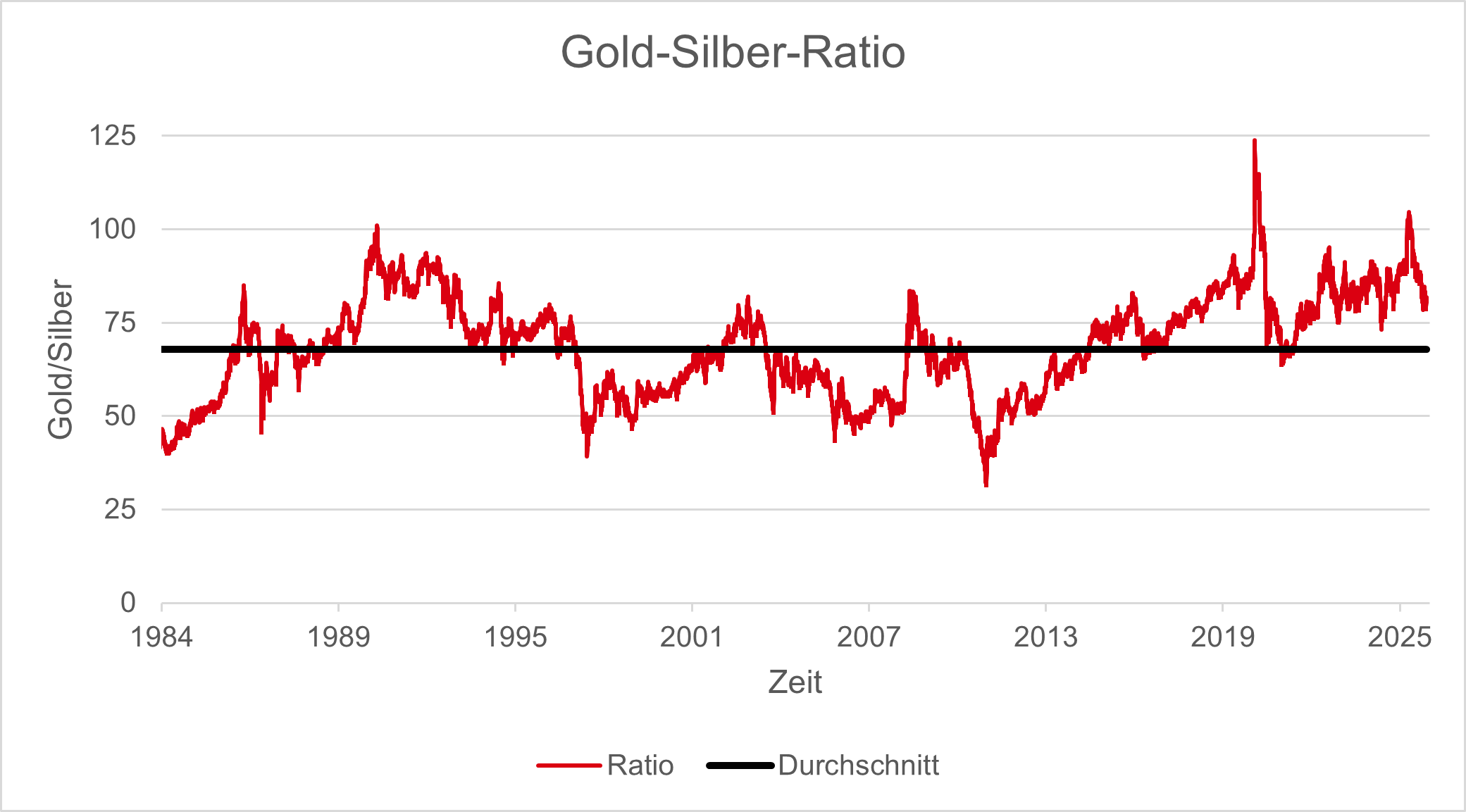 Anhand der Gold/Silber-Ratio lässt sich beobachten, wie viele Unzen Silber man für eine Unze Gold erhält. Sie dient als Indikator, um festzustellen, welches der beiden Edelmetalle im Verhältnis zum anderen unter- oder überbewertet ist. Hierbei lässt sich gut erkennen, dass seit April 2025 neben Gold auch Silber an Attraktivität gewonnen hat. Die Ratio fiel somit seit dem 22.04.2025 von 103,95 auf 81,82 (Stand: 21.11.2025). Folglich nähert sich die Ratio langsam dem Durchschnittsniveau, welches sich bei einem Wert von 67,94 befindet. Auffällig ist, dass sich die unteren Extrempunkte der Ratio vermehrt bei 50 finden. Falls es zu einem solchen Niveau kommen würde, könnte das eine Überbewertung von Silber gegenüber Gold indizieren.