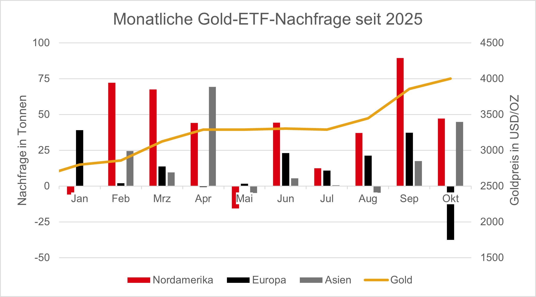 Quelle: Eigene Darstellung anhand der Daten des World Gold Councils und LSEG, Stand: 14.11.2025