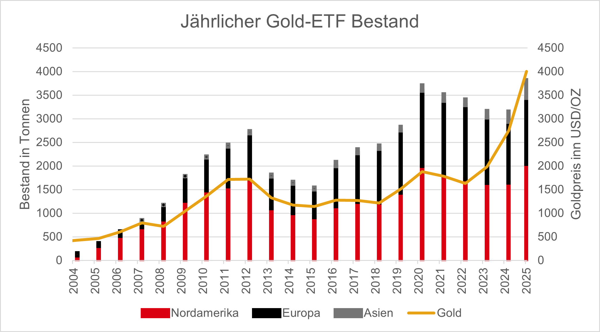 Des Weiteren wird anhand des jährlichen Gold-ETFBestands der starke Anstieg in diesem Jahr ersichtlich. Im Jahr 2024 lag der globale Bestand an Gold, welcher durch ETFs gedeckt wurde, noch bei 3.218,83 Tonnen. Im Oktober 2025 stieg dieser Bestand auf rund 3.892,65 Tonnen. Damit hat sich der Bestand in einem Jahr um etwa 20,9 Prozent erhöht. Der diesjährige Anstieg der globalen Nachfrage nach Gold-ETFs spiegelt sich in einem Jahreszuwachs des Goldpreises von etwa 55 Prozent wider (Quelle: LSEG, Stand: 25.11.2025).
