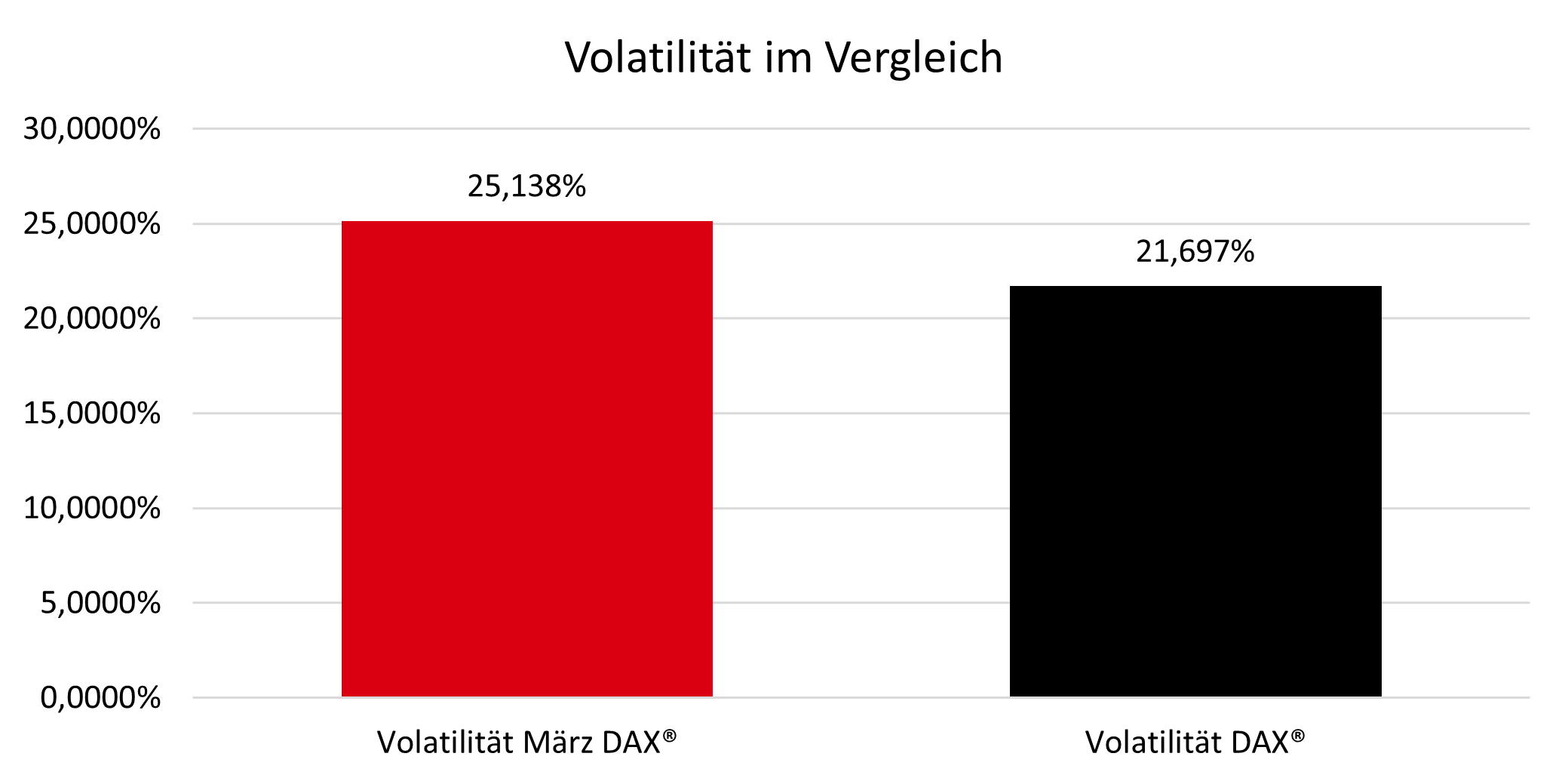 Abschließend betrachten wir wie gewohnt die historische Volatilität des DAX® und vergleichen sie mit der Volatilität im März. Die schwarze Säule gibt die Gesamtvolatilität des DAX® an, während die rote Säule die historische Volatilität des März zeigt. Diese fällt deutlich höher aus als die Gesamtvolatilität des DAX®. Entsprechend folgt, dass wir statistisch gesehen im März mit einer höheren Volatilität rechnen dürfen.