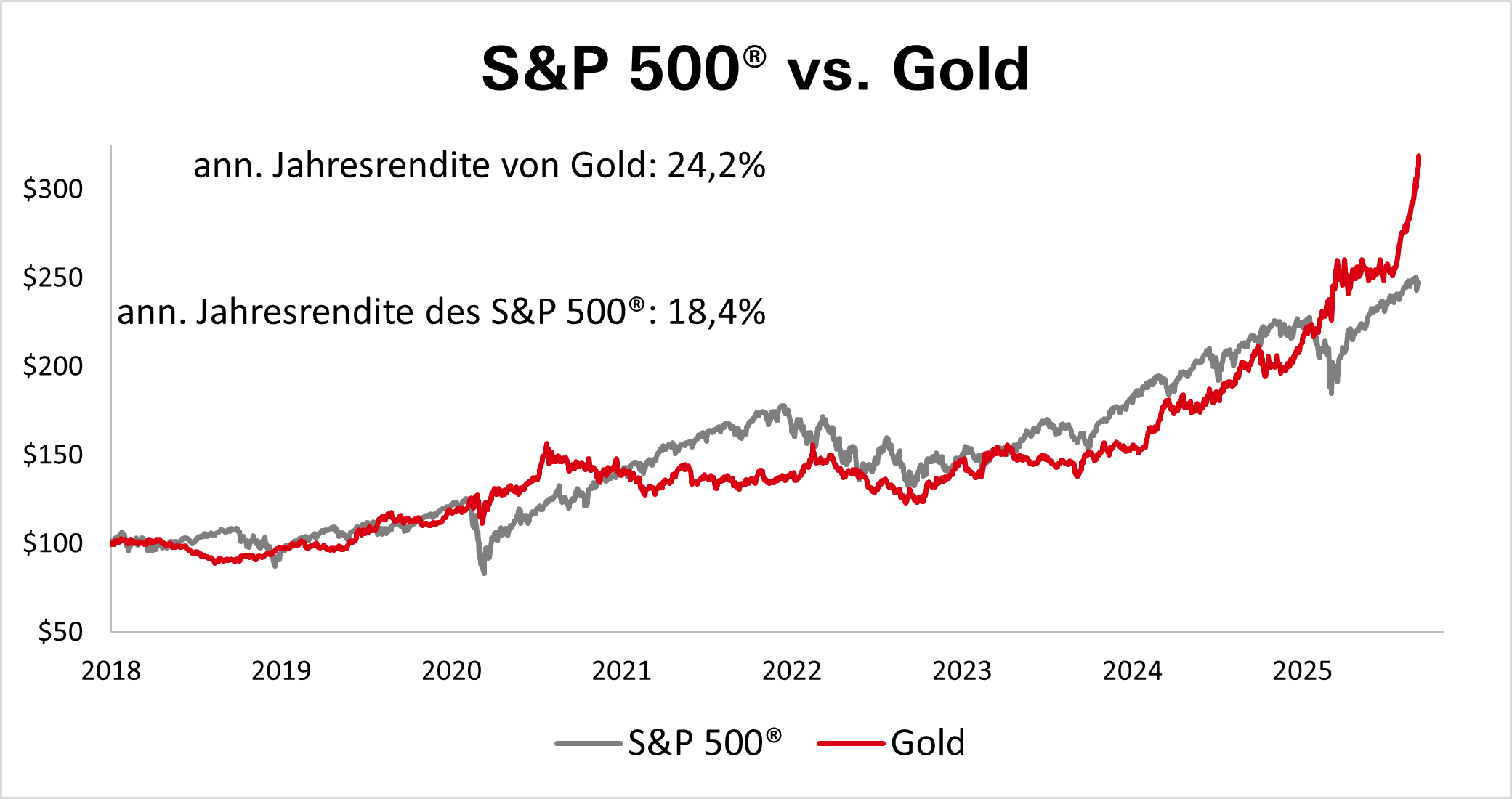 Unser Leiter der Technischen Analyse, Jörg Scherer, sieht dem Jahresende für den Goldkurs auch aus saisonaler Sicht optimistisch entgegen. Er stellt fest, dass Gold in US-Nachwahljahren zwischen Mitte August und Jahresende ein durchschnittliches Kursplus von rund 6 Prozent verzeichnen kann. Der zyklische Trend der letzten 50 Jahre zeigt zudem, dass der Goldpreis vor allem zum Jahresende in den Monaten November und Dezember in der Regel noch mal durchschnittlich etwa um 2 Prozent zulegen kann. Jörg Scherer verglich die jährliche Performance von Gold mit dem S&P 500® und ihm fiel auf, dass der Goldpreis den US-Aktienmarkt seit 2018 prozentual schlagen konnte.