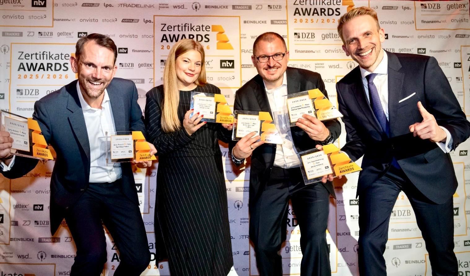 Die ZertifikateAwards gelten als führende Auszeichnung für die besten Anbieter und Produkte im deutschen Markt für strukturierte Wertpapiere. In 2023 wurden sie von der Fachpublikation „Der Zertifikateberater” mit Unterstützung des Hauptsponsors Spectrum Markets und den Premium-Medienpartnern n-tv, finanzen.net, onvista und stock3. verliehen.