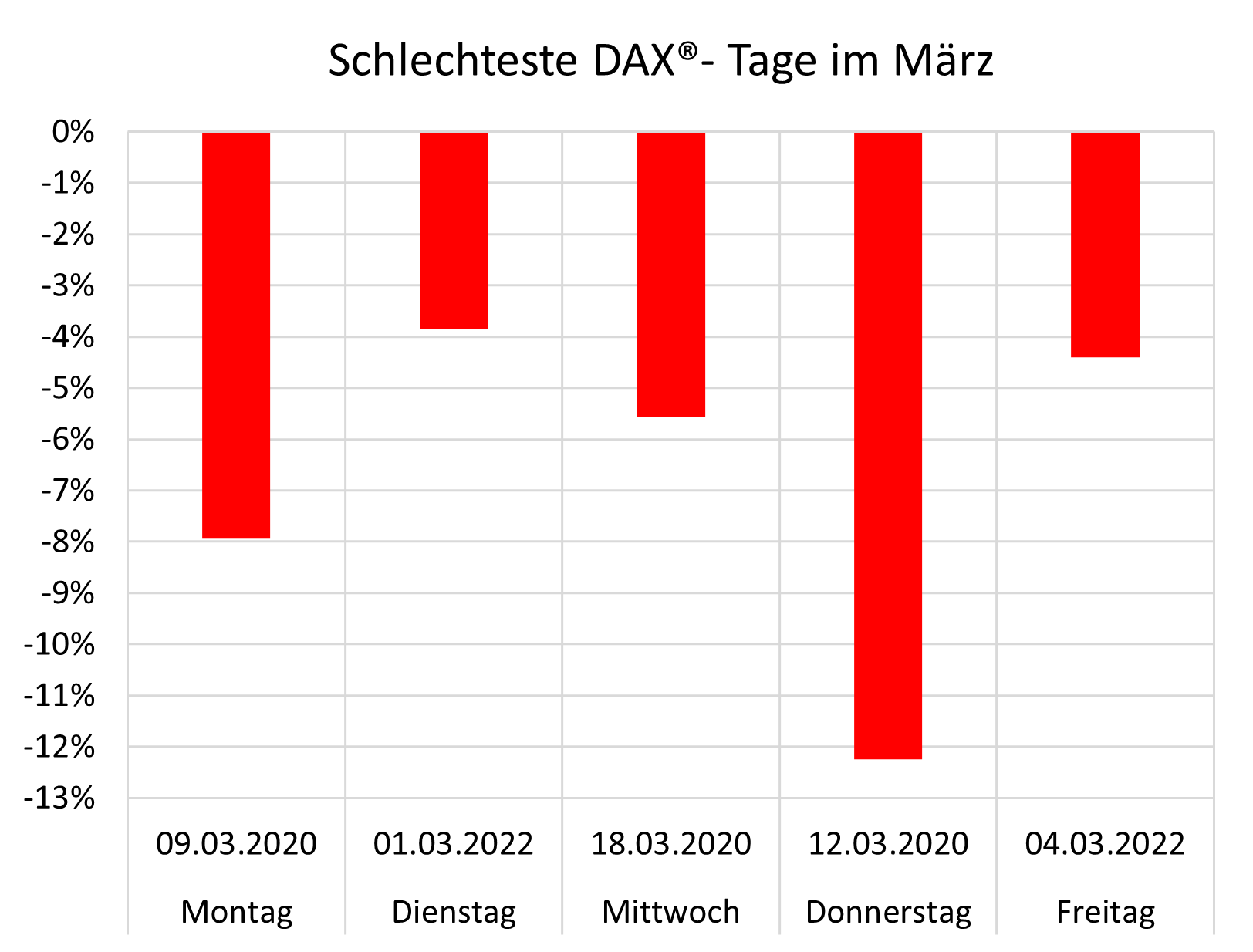 Bisher haben wir nur betrachtet, wie sich die einzelnen März-Monate über die Jahre entwickelten. Im Folgenden gehen wir jedoch tiefer und analysieren die einzelnen Tage der Märzmonate. Zunächst untersuchen wir die Wochentage und ermitteln jeweils den historisch besten sowie den schlechtesten Märzmonat in der Geschichte des DAX®. Die Ergebnisse sind in folgender Grafik dargestellt: