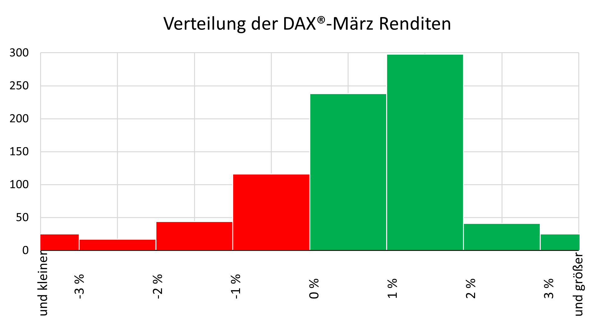 Die obige Grafik zeigt, wie häufig die Tagesrenditen in bestimmten Intervallen lagen. Insbesondere fallen die Intervalle für die Tagesrenditen von 0 bis 1 Prozent sowie von 1 bis 2 Prozent auf. Allein in diesen beiden Bereichen liegen über 65 Prozent aller Tagesrenditen in der gesamten Geschichte. In seiner Gesamtheit fallen etwa drei Viertel aller Handelstage im März positiv aus. Das heißt, dass 602 von 804 Tagen positiv waren.