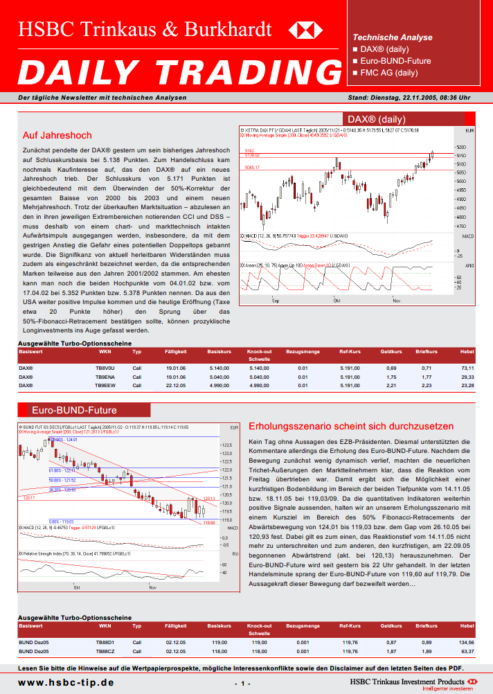Am 22. November 2005 erschien die erste Ausgabe des HSBC Daily Trading. Damals war der Blick noch klar auf den DAX® gerichtet, der bei rund 5.171 Punkten notierte. Der Euro-BUND-Future war ein fester Bestandteil des Daily Trading und Gold näherte sich gerade der Marke von 500 US-Dollar. Was als kompakter morgendlicher Marktkompass begann, ist heute für viele ein fest verankerter Bestandteil des Anlegeralltags geworden.