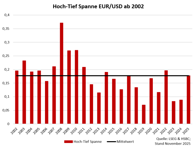 Vor dem Hintergrund der angespannten geopolitischen Lage, immer neuen Zollstreitigkeiten sowie der deutlich anziehenden Langfristzinsen gilt es, die entscheidenden charttechnischen Leitplanken abzustecken. Schließlich könnte der Druck im Sinne des angeführten Connally- Zitats auch 2026 hoch bleiben. In guter alter Tradition steigen wir in den Währungsausblick mit der Analyse der Schwankungsintensität der europäischen Valuta zum Greenback ein. Nach dem Motto: „Die Vola ist tot, lange lebe die Vola!“ verfolgen wir seit 2019 die jährlichen Hoch-Tief-Spannen des Währungspaars zurück bis in die 1970er Jahre. Vor Einführung der europäischen Einheitswährung wurden die Jahresschwankungsbreiten auf Basis des DM/USD-Wechselkursverhältnisses zurückgerechnet. „Aufhänger“ war damals die historisch extrem niedrige High-Low-Spanne, wovon auch die Investmentjahrgänge 2023 und 2024 geprägt waren. Erwartungsgemäß hat die historische Bewegungsarmut den Grundstein für den Vola-Impuls des Jahres 2025 gelegt. Schließlich lagen im zu Ende gehenden Jahr zwischen Jahreshoch (1,1918 USD) und -tief (1,0142 USD) knapp 18 US-Cents (siehe Chart), was ziemlich exakt dem langfristigen Mittel entspricht.