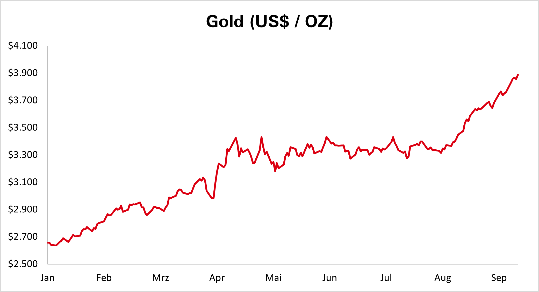Aufgrund der Dollarschwäche, möglicher Zinssenkungen der Fed, einer hohen Nachfrage nach Gold gedeckten ETFs und der geopolitischen Unsicherheiten werden diversen Marktberichten zufolge zum Jahresende weiterhin hohe, aber volatile Goldpreise erwartet. Es wird allerdings auch erwähnt, dass signifikante Gewinne von den aktuell hohen Niveaus aus zunehmend schwieriger zu erzielen sein könnten.